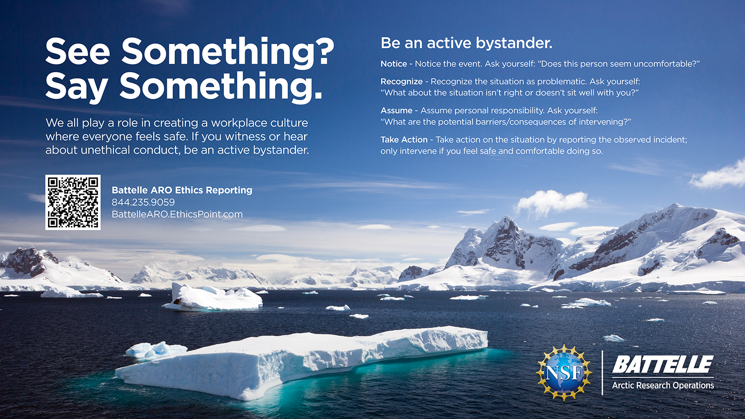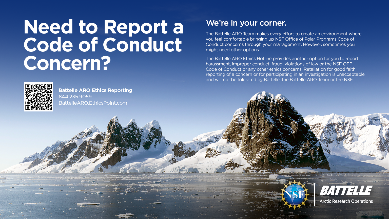 Battelle Arctic Research Operations is committed to an environment where open, honest communications are the expectation, not the exception. We want you to feel comfortable in approaching your supervisor, your management, or a member of the Battelle Arctic Research Operations Team in instances where you believe violations of policies or standards have occurred.